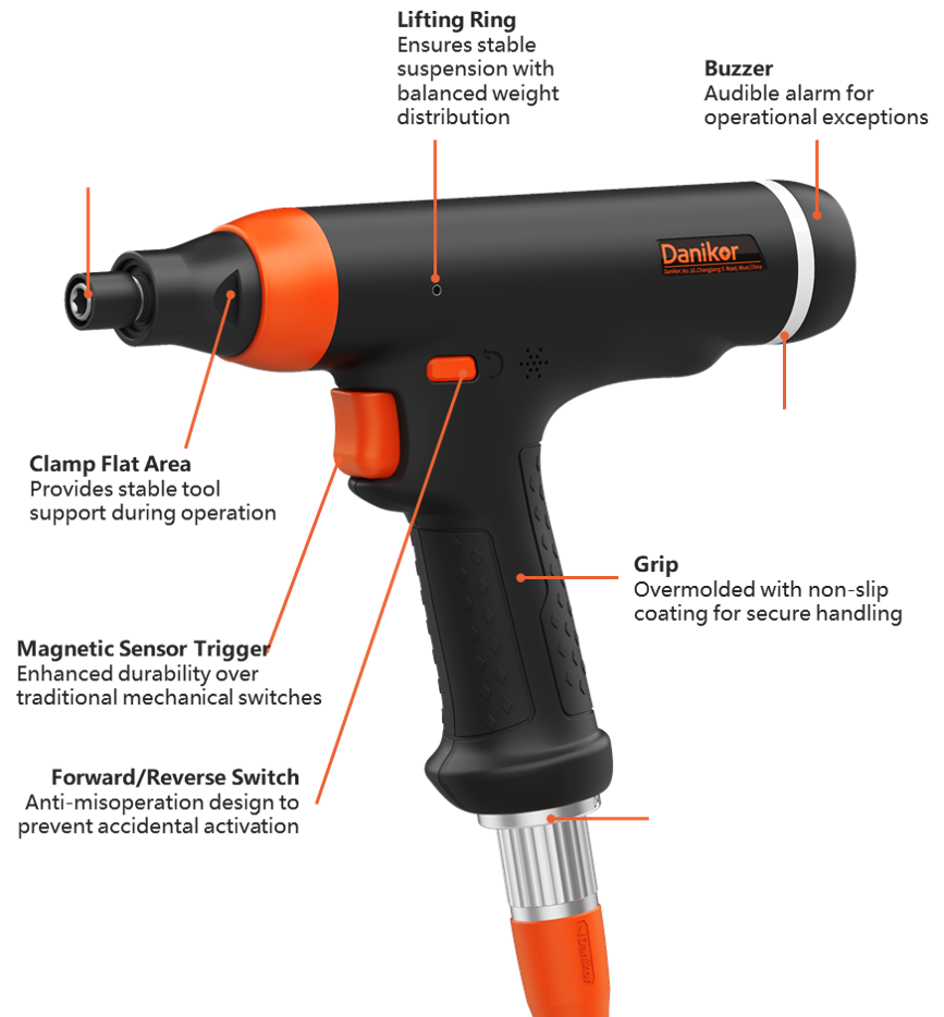 Equipped with pulse technology and a high-speed motor, it delivers zero-reaction-force, high-speed, and high-precision tightening, ensuring effortless operation even during prolonged use. Crafted from specialized anti-static materials, it provides comprehensive safety protection. Paired with CM series controller, it caters to manual application scenarios across multiple industries, significantly enhancing assembly quality and consistency on production lines.