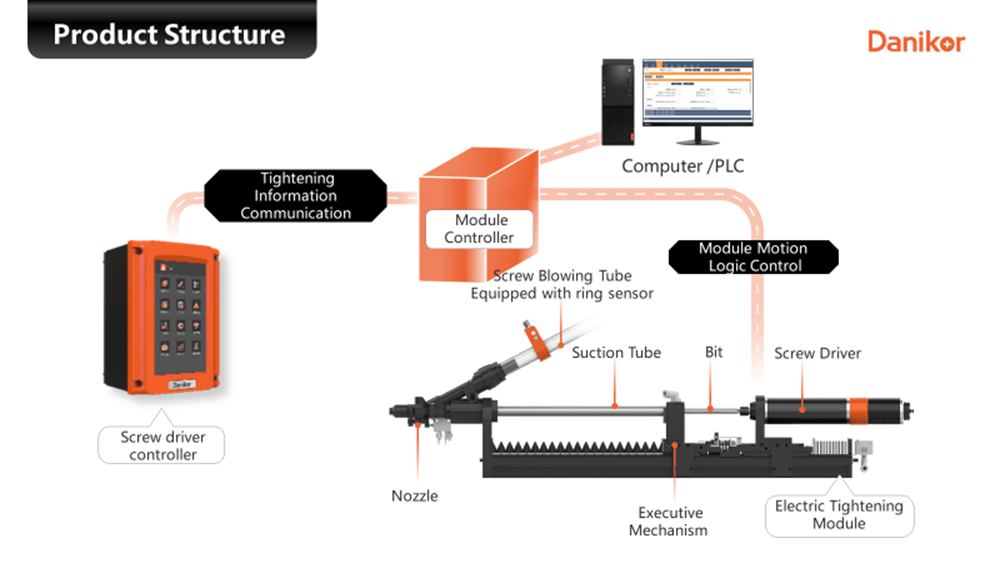 The Electric Tightening Module uses electric drive to replace the traditional integrated tightening tool, enabling the automatic tightening process of screws. It can monitor all elements of the tightening process and is highly compatible with various special working conditions and product height differences.